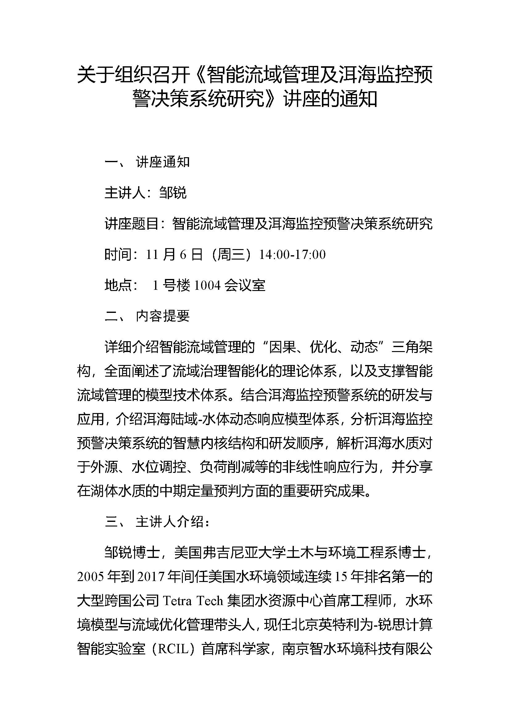 2019年11月6日下午,北京英特-南京智水首席科學家鄒銳博士將應邀赴中國環(huán)境科學研究院進行題為“智能流域管理及洱海監(jiān)控預警決策系統(tǒng)研究”的學術報告,歡迎有意參加的研究人員提前報名。
