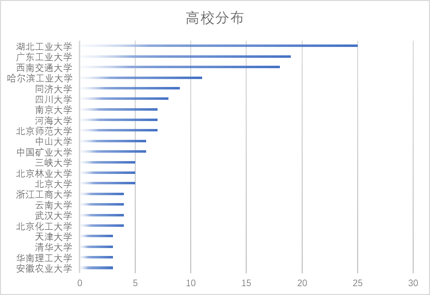 截止2020年10月10日,第三屆全國大學生水環境模型模擬大賽已圓滿落幕。本次大賽共得到了來自72所高校近250名同學的積極響應,其中參賽人數最多的是湖北工業大學,共有25人參賽,其它參賽人數較多的大學還包括廣東工業大學、西南交通大學、哈爾濱工業大學、同濟大學、四川大學等(圖1);參賽選手所屬的專業方向共43個,其中環境科學與工程(環境科學與環境工程并入環境科學與工程)(110人)方向的參賽同學占主導(圖2)。