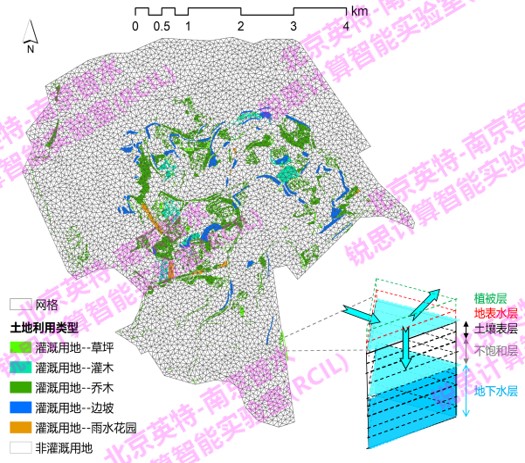 基于Inteliway-SS3D模型求解三維地表水-地下水模型和生態(tài)需水模型,預(yù)測新區(qū)各高位水池和雨水調(diào)蓄池服務(wù)片區(qū)的綠地每日生態(tài)需水量