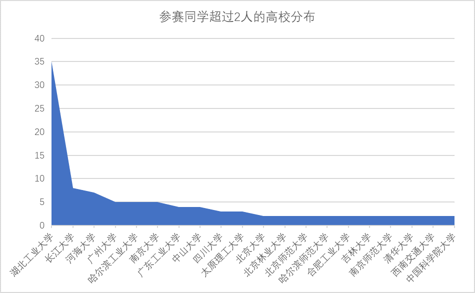 截止2021年10月11日,第四屆全國大學生水環(huán)境模型模擬大賽已圓滿落幕。本次大賽共得到了來自45所高校150余名同學的積極響應,其中參賽人數(shù)最多的是湖北工業(yè)大學,共有35人參賽,其它參賽人數(shù)較多的大學還包括長江大學、河海大學、廣州大學、哈爾濱工業(yè)大學、南京大學、廣東工業(yè)大學、中山大學、四川大學、太原理工大學、北京大學等(圖1);參賽選手所屬的專業(yè)方向共41個,其中環(huán)境工程類與環(huán)境科學類(共計63人)方向的參賽同學占主導(圖2)。截止2021年10月11日,第四屆全國大學生水環(huán)境模型模擬大賽已圓滿落幕。本次大賽共得到了來自45所高校150余名同學的積極響應,其中參賽人數(shù)最多的是湖北工業(yè)大學,共有35人參賽,其它參賽人數(shù)較多的大學還包括長江大學、河海大學、廣州大學、哈爾濱工業(yè)大學、南京大學、廣東工業(yè)大學、中山大學、四川大學、太原理工大學、北京大學等(圖1);參賽選手所屬的專業(yè)方向共41個,其中環(huán)境工程類與環(huán)境科學類(共計63人)方向的參賽同學占主導(圖2)。